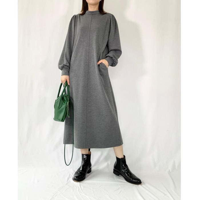 ボリュームのあるパフスリーブに、身頃はスッキリとしたシルエットのワンピース。